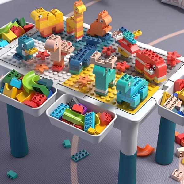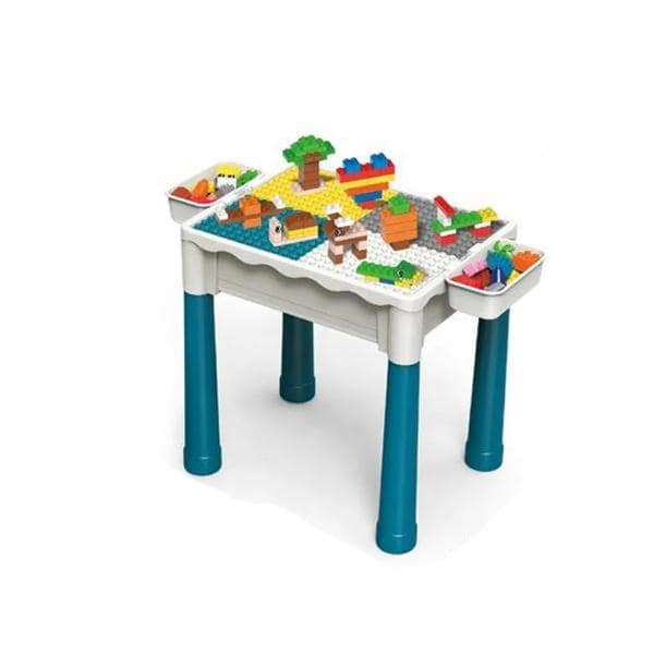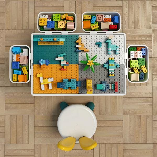 Miza je uporabna na obeh straneh, pri čemer je ena stran namenjena sestavljanju blokov, druga pa ima ravno površino.